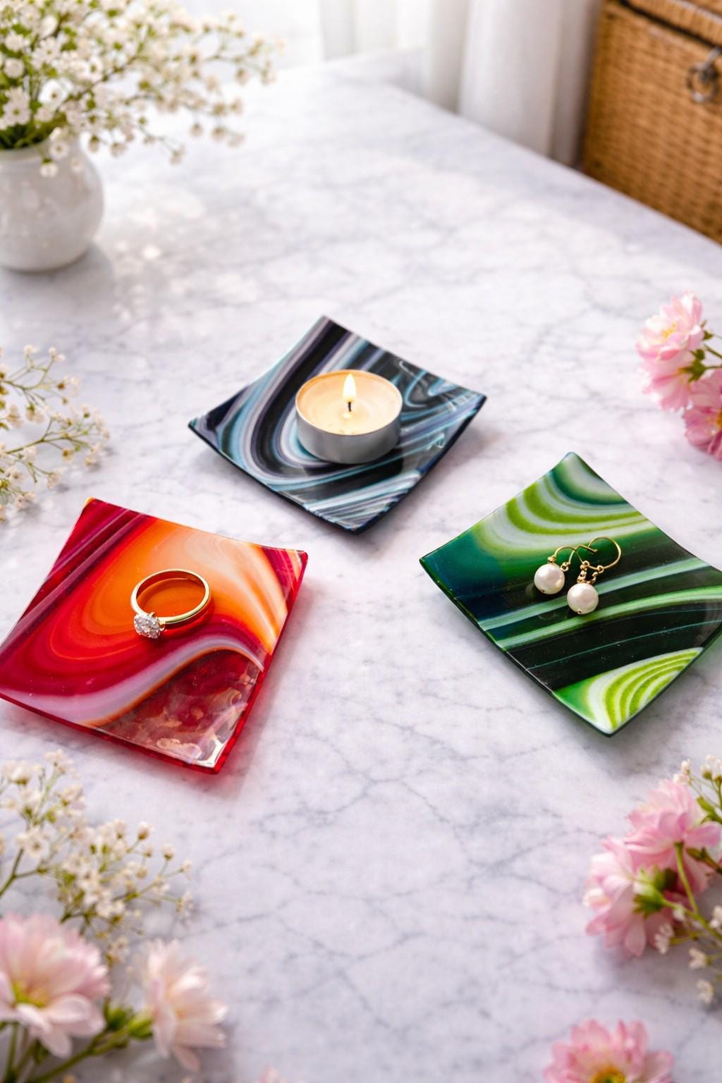 Beautiful handcrafted fused glass trinket dishes designed for everyday use. Each dish is kiln-fired using high-quality COE 96 glass, creating a durable and unique piece of art. The vibrant colors and flowing patterns make every dish truly one of a kind—perfect for holding jewelry, keys, or small treasures.