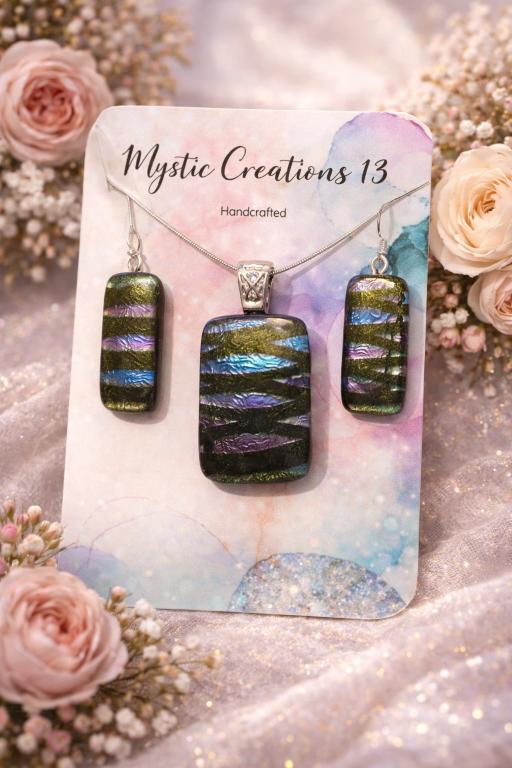 Hand Crafted Dichroic Blue, Purple and Black Pendant with Matching Earrings