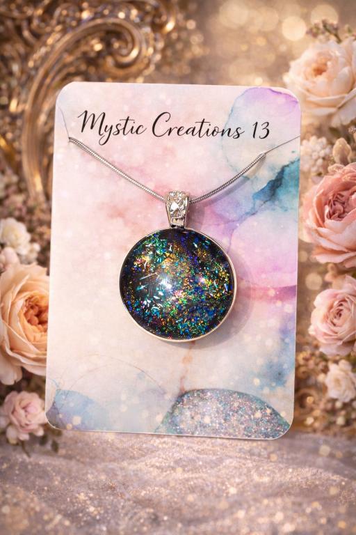 Hand Crafted Dichroic Fused Multi Color Explosion Glass Pendant. My pendant comes with a 20-inch sterling silver chain.
